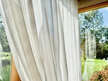 Simple linen curtains (like these) can make mornings feel quieter and evenings feel warmer.