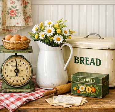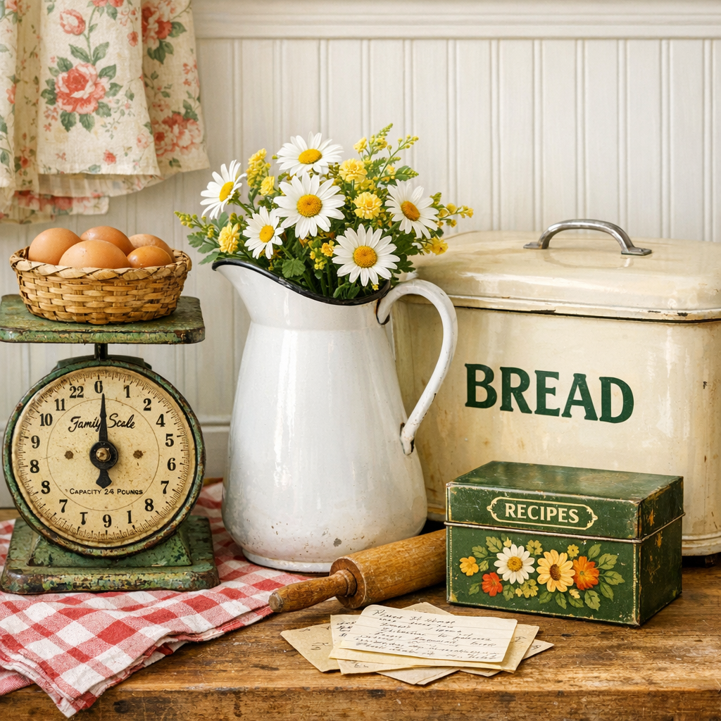 A vintage cottage kitchen feels warm, welcoming, and full of character. Instead of perfectly matched decor, cottage kitchens are built from pieces that feel collected over time—antique dishes, wooden accents, floral fabrics, and simple natural touches.