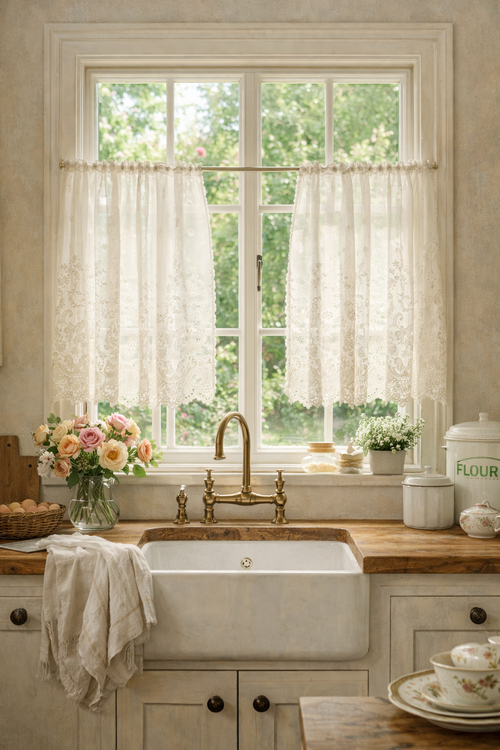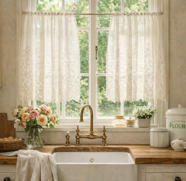 Soft window treatments are one of the defining features of cottage kitchens.