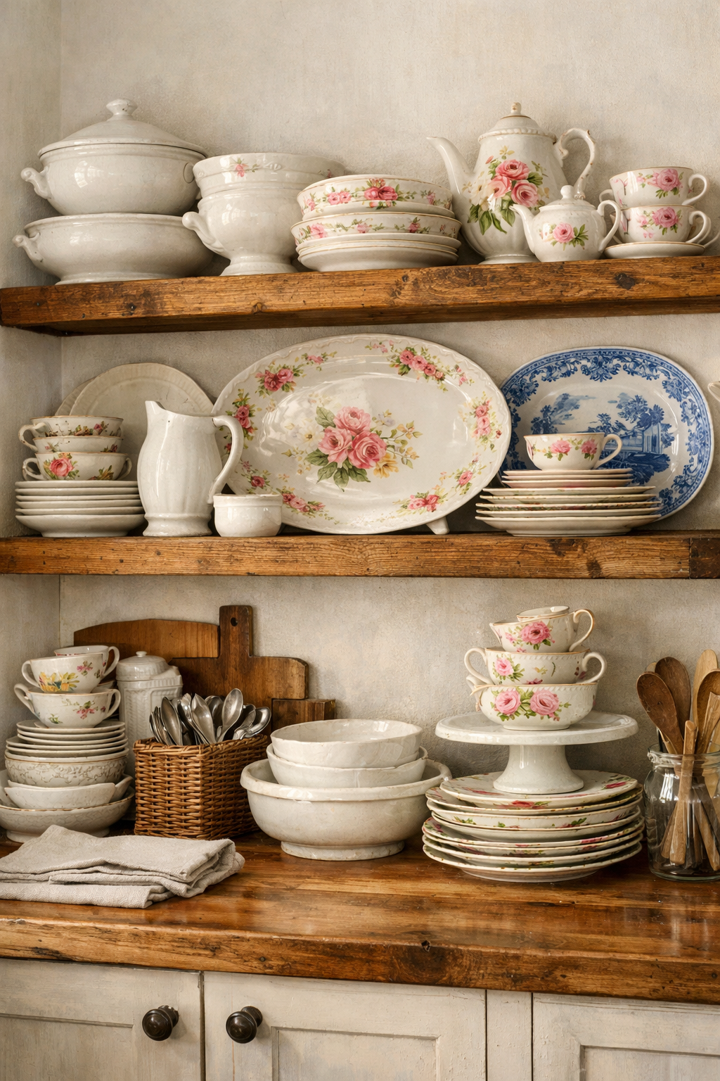Displaying dishes instantly makes a kitchen feel more personal. A classic ironstone dish set is one of the easiest ways to create that vintage cottage look.